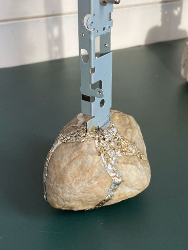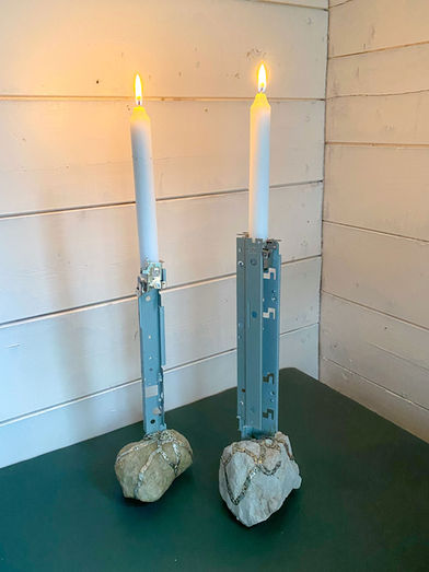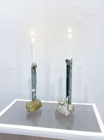 Die Kerzenständer bestehen aus Blechelementen, gewonnen aus anthropogenem Elektroschrott, die sich wie metallische Wurzeln um einen natürlichen Stein legen. Die Kombination aus unbearbeitetem Naturmaterial und industriell gefertigtem Restmaterial thematisiert das parasitäre Eindringen menschlicher Produktion in natürliche Strukturen. Als funktionale Objekte verbinden die Kerzenständer einfache Nutzung mit einer kritischen Auseinandersetzung mit Materialwert, Ursprung und der Präsenz des Anthropozäns im Alltag.